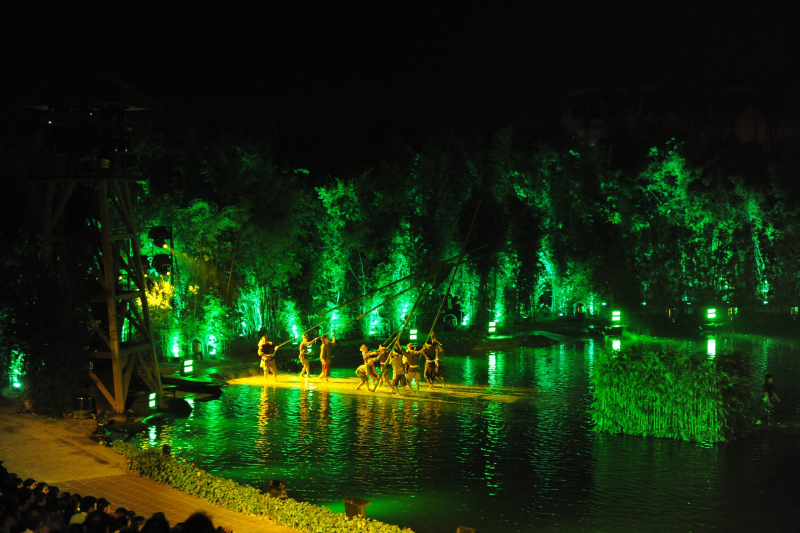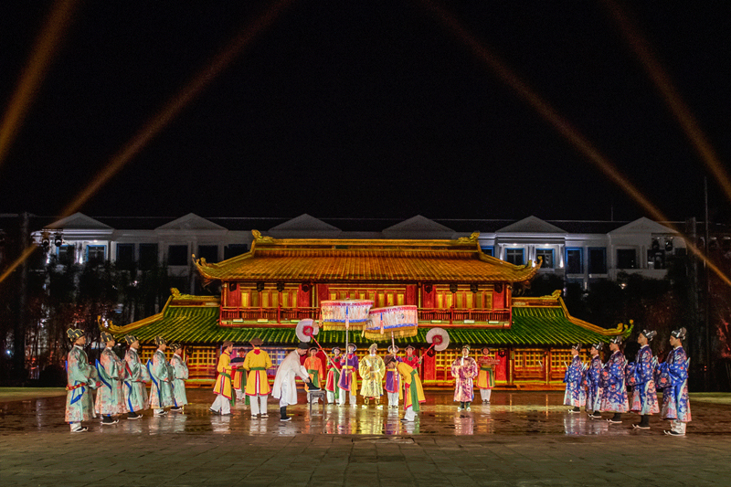 Điểm nhấn đặc biệt và hấp dẫn nhất của show diễn này là phần trình chiếu “thực cảnh đa phương tiện” kéo dài trong 45 phút với 4 chương trình (Nguồn cội, Đời sống, Hành trình đạo học và Tinh hoa Việt Nam) và 12 màn biểu diễn xuyên suốt. Khi xem buổi biểu diễn, du khách sẽ có cảm giác được “du hành thời gian“, trở về với một nước Việt cổ xưa với những phong tục, tập quán và nét văn hoá mà ngày nay đã dần mai một, thậm chí biến mất.