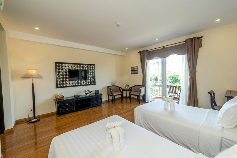 Các căn phòng tại đây được trang trí theo phong cách nhẹ nhàng, tao nhã và đặc biệt là đều có view thẳng ra hướng sông Thu Bồn và thành phố Hội An. Không chỉ thế, khách du lịch Hội An khi lựa chọn lưu trú tại Hotel Royal Hoi An còn được sử dụng một số dịch vụ miễn phí như: ký gửi hành lý, đưa đón miễn phí, mua vé tham quan, thuê xe đạp…