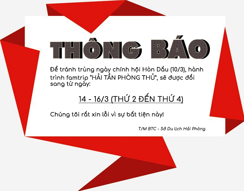Kính gửi các quý đại biểu đăng ký tham gia chương trình famtrip “Hải Tần Phòng Thủ”, do thời điểm khởi hành ban đầu của đoàn đưa ra trùng với ngày chính hội tại đảo Hòn Dấu, nên thay vì lịch khởi hành 10/3, chúng ta sẽ đổi sang ngày 14/03.